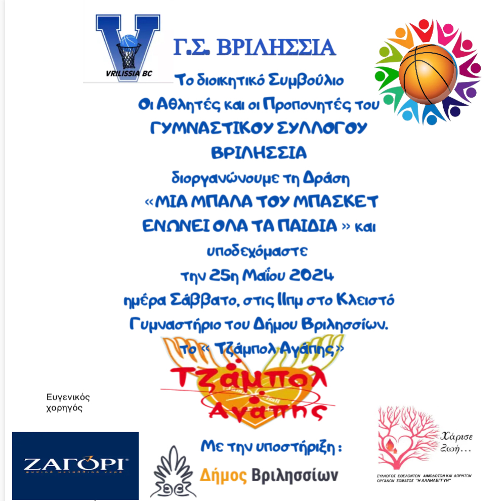 Το Διοικητικό Συμβούλιο, οι Αθλητές και οι Προπονητές του ΓΥΜΝΑΣΤΙΚΟΥ ΣΥΛΛΟΓΟΥ « ΒΡΙΛΗΣΣΙΑ» διοργανώνουν σε συνεργασία με το «ΤΖΑΜΠΟΛ ΑΓΑΠΗΣ», μία προπόνηση Συνεκπαίδευσης. Ο ΑΘΛΗΤΙΣΜΟΣ μπορεί και ενώνει όλους τους ανθρώπους στον ίδιο σκοπό και ο Γ.Σ. ΒΡΙΛΗΣΣΙΩΝ προετοιμάζει την καλύτερη δράση καλαθοσφαίρισης.